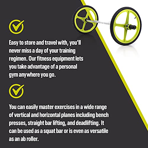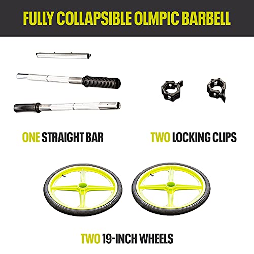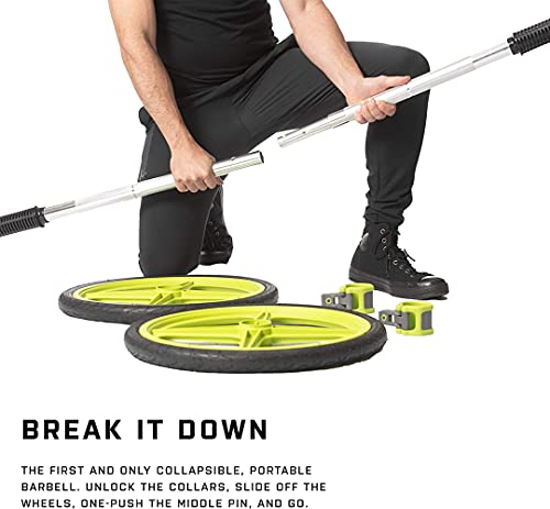 Ultra Lightweight and Collapsible: Our quick to assemble portable barbell is not only collapsible but lightweight at only 11.2 pounds. Making it perfect for fitness enthusiasts on the go. Whether at your home gym, in the office, or on vacation, you can get a workout anywhere. This Olympic barbell includes a straight bar, two 19-inch wheels, and two impact-engineered ACS end locking clips, featuring anodized aluminum. This 1.5-inch weight bar can accommodate any Olympic plate or strength band.