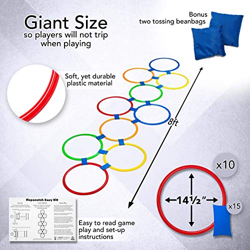⚪LARGE SIZE – 27 piece set includes (10) 14 and 1/2″ Rings so players won’t trip while playing, 15 Connectors, and 2 premium beanbags!